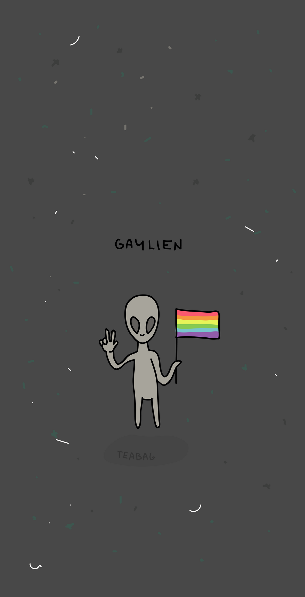 2 colour option wallpaper with a pun "gaylien" , there is a little alien with a pride flag and peace sign